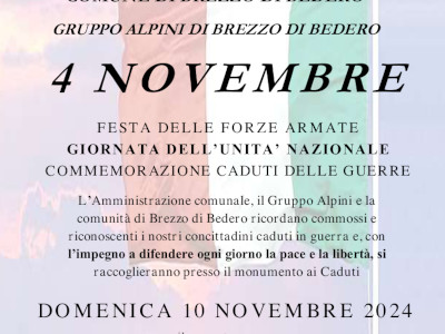 L’Amministrazione comunale, il Gruppo Alpini e la comunità di Brezzo di Bedero ricordano commossi e riconoscenti i nostri concittadini caduti in guerra e, con l’impegno a difendere ogni giorno la pace e la libertà, si raccoglieranno presso il monumento ai Caduti domenica 10 novembre 2024 con il seguente programma.